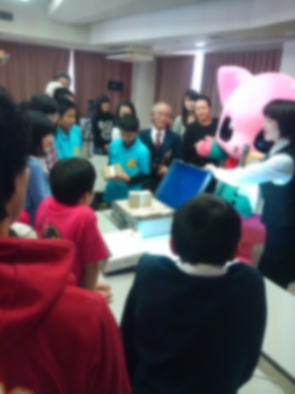 そして様子が分かりませんが、島根銀行さんのキャラクターしまにーと、お金の授業があったのかな?お姉さんがマイクをもち、ジュラルミンケースの中には札束!!!